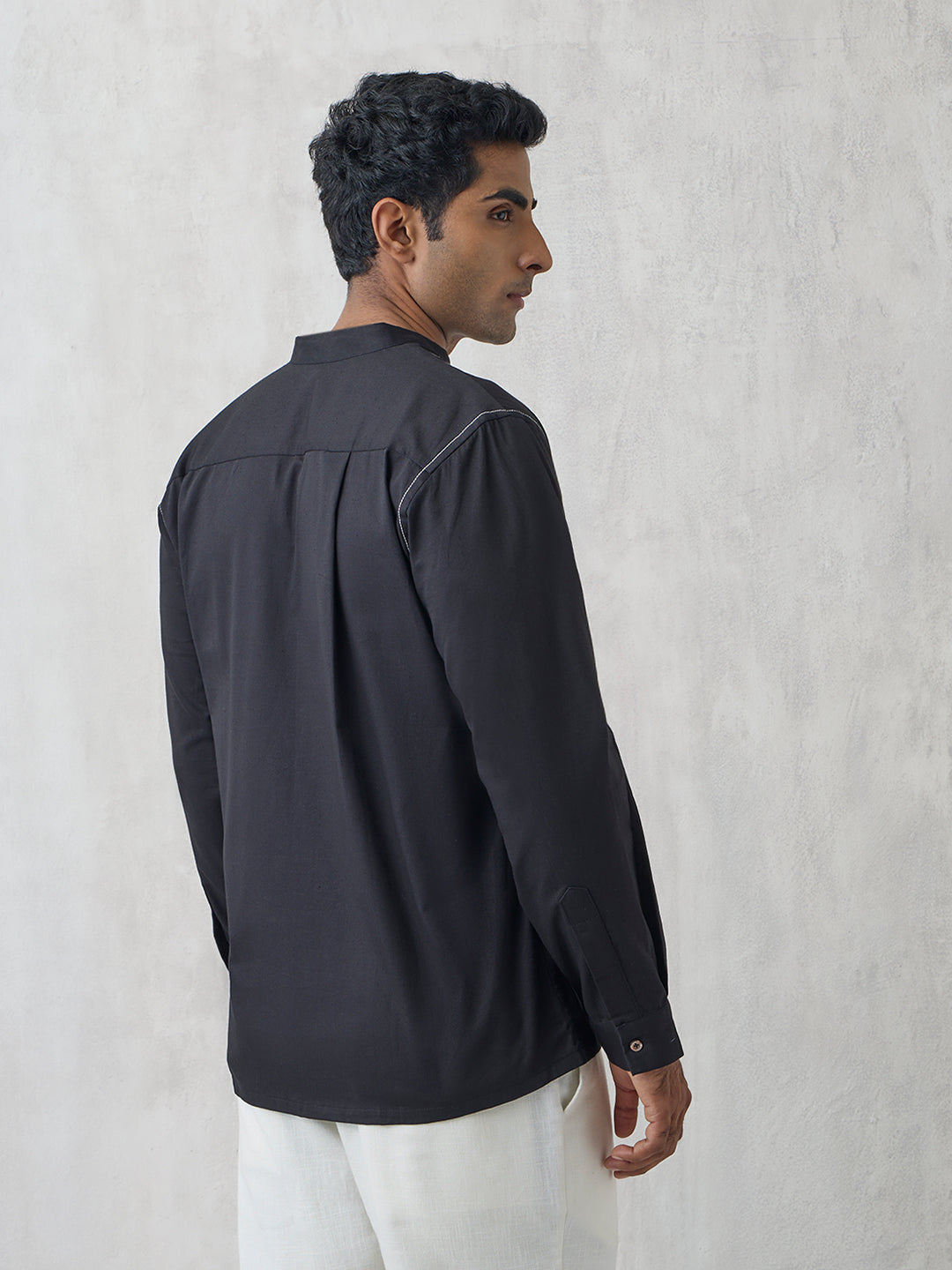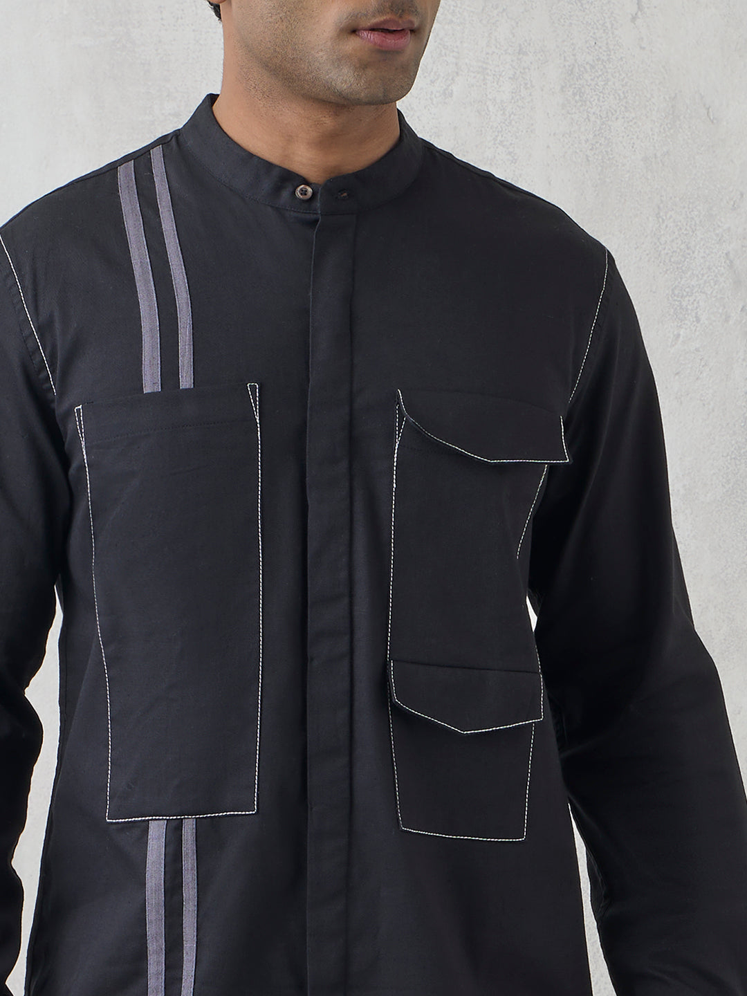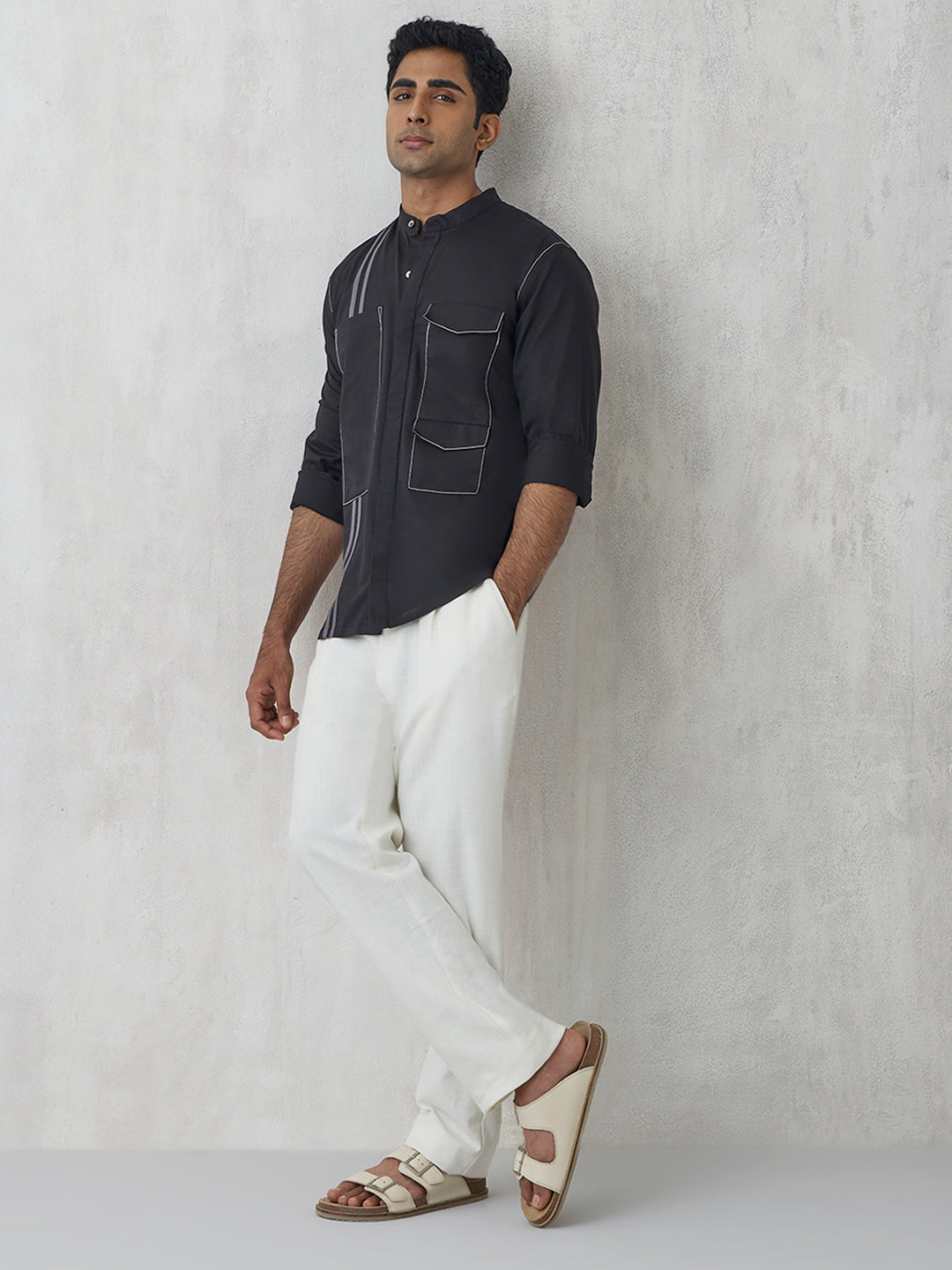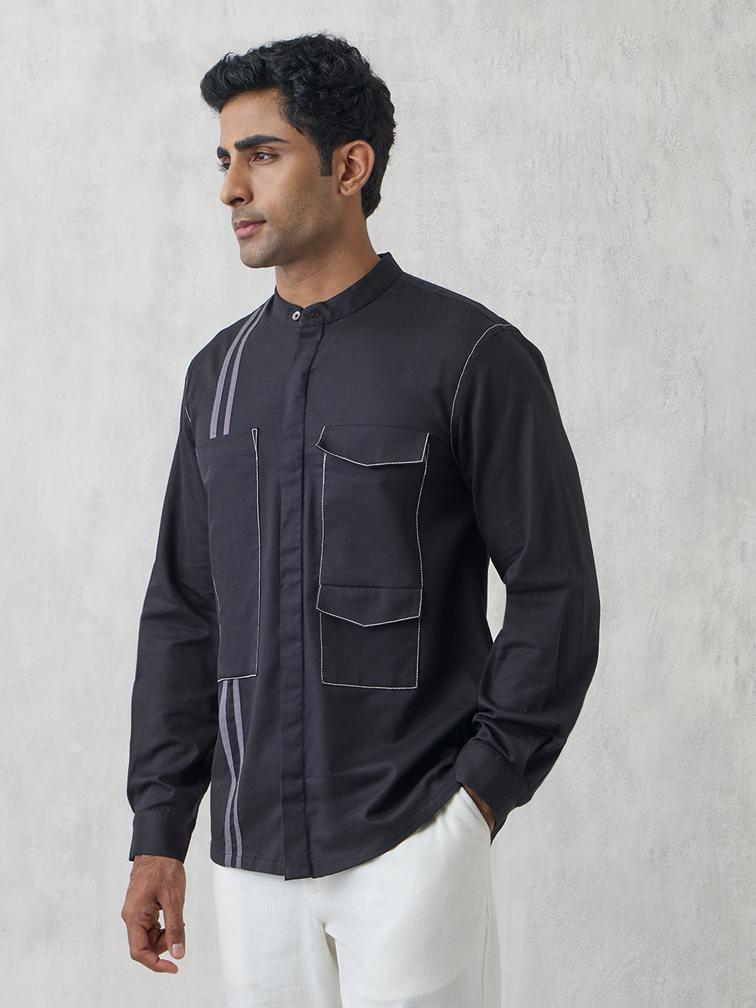 Make a statement this festive season with this navy shirt, designed with asymmetric detailing for a modern edge. White outlines and twin stripes add striking contrast, while a band collar and long sleeves ensure refined versatility.
