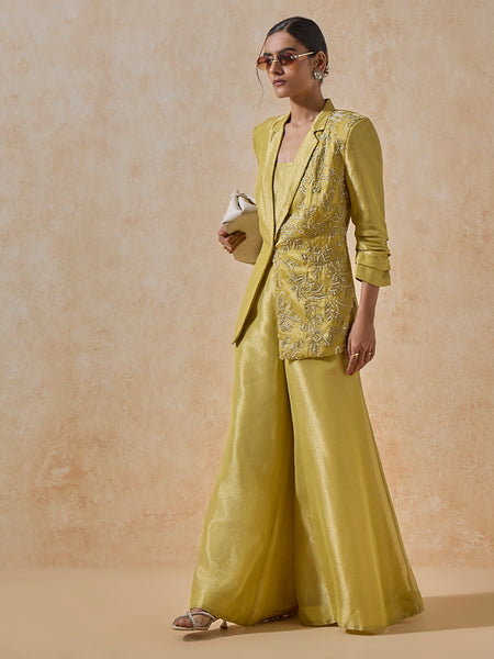 An ode to contemporary glamour, this lime blazer and inner set lights up the room with its metallic sheen and embellished detailing. The single-button blazer features a notched lapel collar, ruched sleeves, and asymmetric embellishment for a hint of drama. Style it with sleek trousers and heels for evenings that blend celebration with edge.