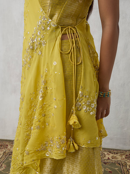 This yellow embellished cape is designed to instantly elevate festive separates. Woven in sheer fabric, it is scattered with sequins and delicate embroidery that catch the light with every movement. Finished with playful tassel ties at the side, it layers beautifully over kurtas, dresses, or blouses to bring a touch of glamour to any celebration.