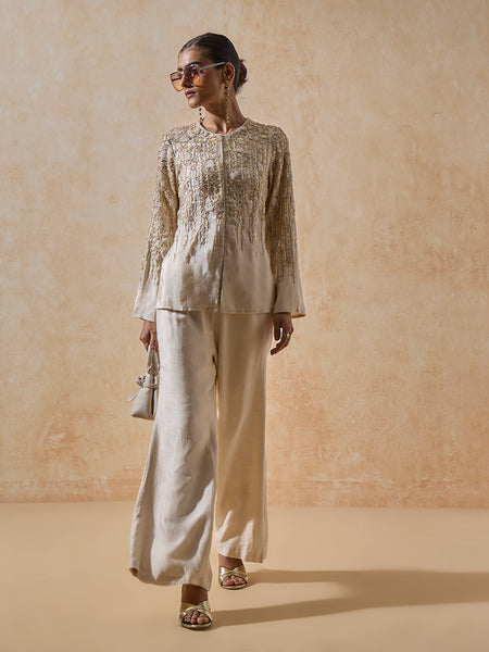 Perfect for festive moments that feel intimate yet special, this ivory ensemble captures quiet luxury. The full-sleeve top with a round neck is richly embellished with beads and sequins, offering texture and depth. It is styled with flowing wide-leg trousers that balance the ornate detailing with modern simplicity.