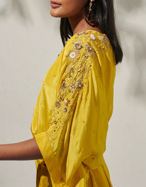 Swish through party season with this pretty yellow kaftaan ,with a boatneck and keyhole-detailing. The neckline and sleeves are decorated with embellishments, while the tasseled tie-up at the waist accentuates your curves. Style yours with delicate jewellery and sandals for a finished look.