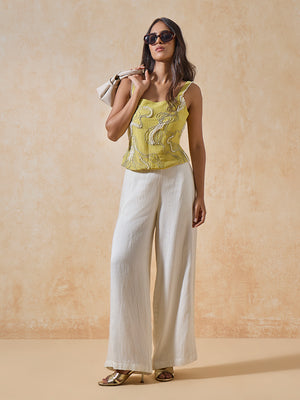 Add a touch of radiant elegance to your wardrobe with this yellow tank top, crafted in a textured crinkled fabric. The square neckline is framed by pearl-embellished straps, while the front is richly detailed with swirling silver embroidery and delicate beadwork. Styled over pleated white separates, it brings effortless sophistication to daytime occasions and evening edits alike.