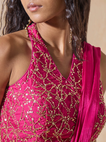 Update your traditional wear with this pink blouse. Encrusted with intricate sequin details all over for added sophistication, this sleeveless blouse is designed with a V-neckline as well as a keyhole detailing at the back for added chicness.