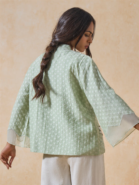Elevate your layering edit with this green jacket, designed in a textured crinkled fabric with a faint patterned base. Styled with a high band collar and a central zip closure, it is embellished with delicate embroidered floral appliqués for a refined touch. The three-quarter sleeves finish with sheer organza cuffs that add fluidity and charm.