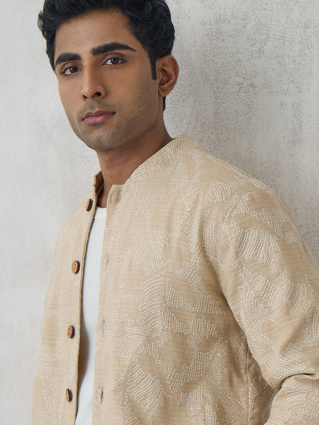 Perfect for layered festive looks, this beige jacket from Samoh is styled with tonal embroidered swirls for subtle texture. A band collar, oversized buttons and long sleeves add refinement, making it an effortless companion for celebratory dressing.