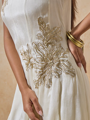 For the woman who prefers her glamour subtle, this white dress is all about timeless allure. Crafted with a round neckline and sleeveless design, it’s detailed with glistening gold embroidery that enhances its fluid structure. The result is a silhouette that’s elegant, effortless, and undeniably graceful.