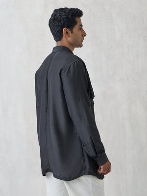 Crafted for after-dark soirees, this black shirt stands out with dotted embroidery arranged in artistic lines. A notched collar and long sleeves frame the silhouette, while its subtle sheen makes it perfect for evening gatherings and festive wear.