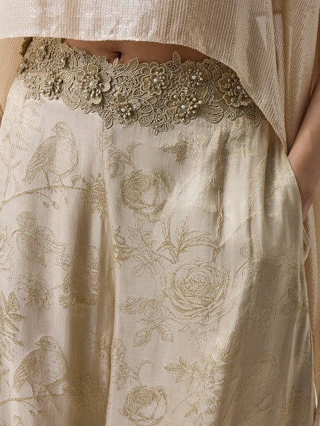 Infuse elegance into your occasion wear assortment with this ethnic set. The boat neck top is cut with an Asymmetrical design adorned with tassels and detailed with delicate floral embroidered work at the front. It's accompanied by a pair of matching wide-leg palazzos covered with bird and rose patterns, adorned with intricate floral embroidered designs at the hemline for added femininity.