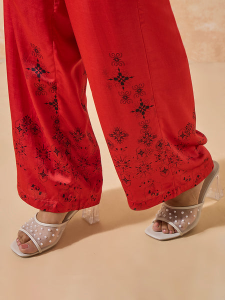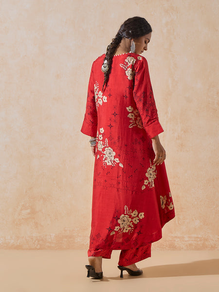 Up your style quotient with this red kurta set. The floral-printed kurta is created with a notched-neckline, three quarter sleeves as well as a high-low hemline for added charm. It is completed by a pair of ethnic printed palazzos featuring an elasticated waistline, a concealed zip fastening at the side and a slit pocket for practicality.