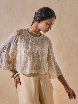 Bring ethereal designs to your ethnic capsule with this ivory top. Fashioned with a round neckline, this sheer top is designed with three-quarter flared sleeves with scalloped details. Encrusted with delicate floral beadwork, this lightweight style comes finished with a keyhole detailing at the back fixed with a button fastening for added charm.