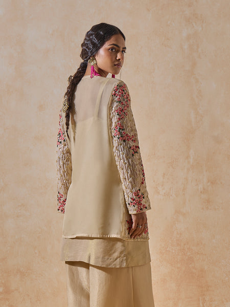 Enhance your ethnic semblance with a chic layering option, like this kurta. Thoughtfully crafted with a mix of Geometric patterned sequins, vivid floral embroidery and delicate beadwork along the placket and collar, this separate comes finished with full length sleeves and a tie-up feature with tassels for added style.