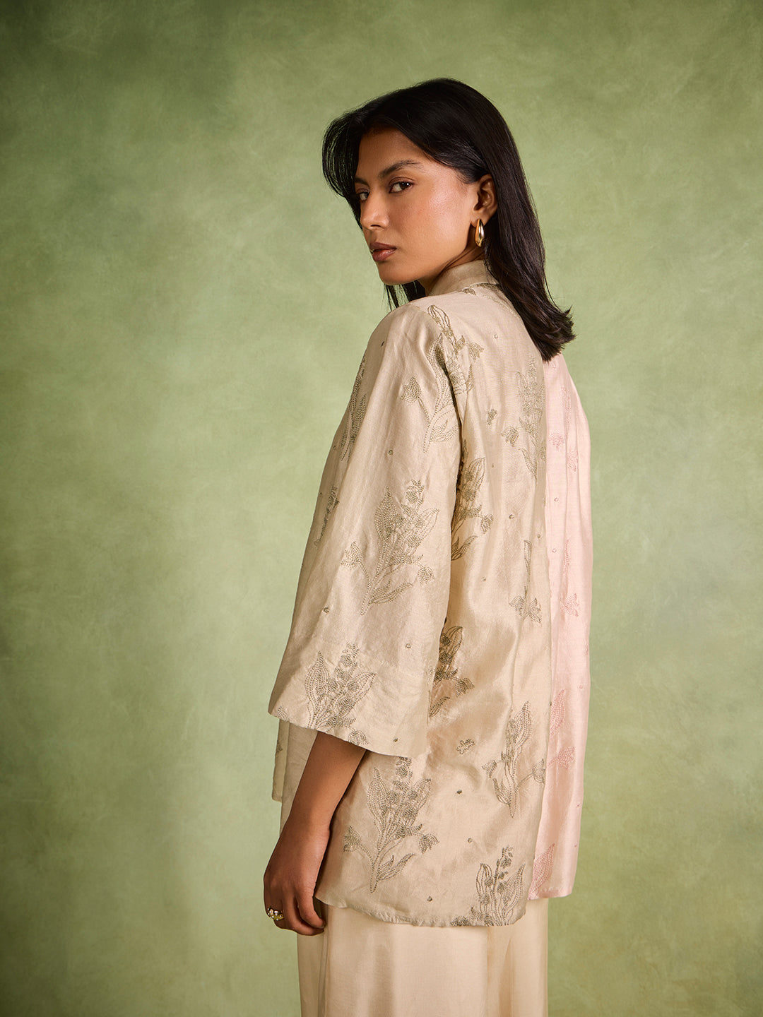 Graceful botanical embroidery brings a quiet elegance to this beige shirt, lending the piece a refined, artisanal character. Designed with a classic collar, a button-down front and three-quarter sleeves, the silhouette balances structure with ease. Intricate floral motifs scattered across the surface create subtle depth, giving the shirt a composed presence suited to tailored trousers.