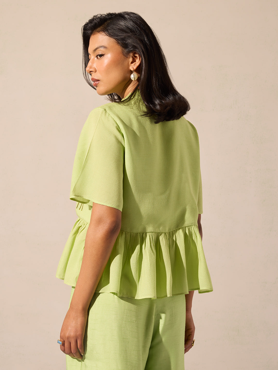 Simple to wear and easy to style, this green top fits into everyday plans. Crafted from a textured fabric, it features a soft ruffled neckline, concealed button placket, short sleeves, and a gently flared peplum that adds easy movement. Delicate floral embroidery along the front brings a crafted detail without feeling fussy. Easy to pair with tailored pants, it works well for casual lunches, daytime outings, and relaxed summer plans.