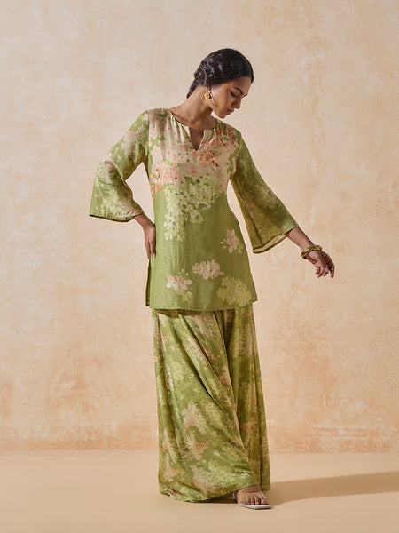 Balanced with chic botanical prints, this green kurta set captures the essence of easy sophistication. The kurta features a split neck and flared sleeves, creating a graceful silhouette that flows effortlessly into wide-leg pants. Perfect for daytime gatherings, it brings comfort and understated elegance together in one ensemble.