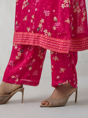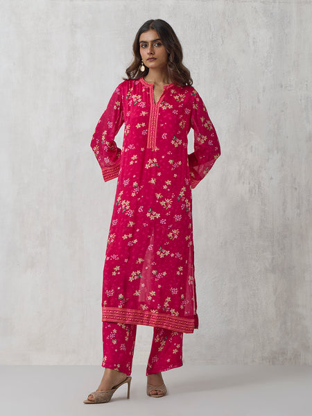 This pink kurta and pant set embodies refined festive elegance. Floral patterns bloom across the fabric, while the split neck and embroidered placket offer understated sophistication. Flared sleeves add movement and grace, and the matching pants ensure a polished silhouette.