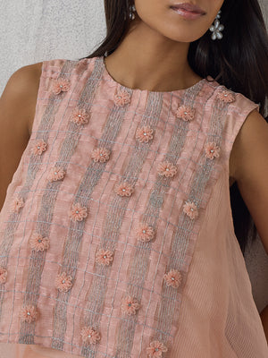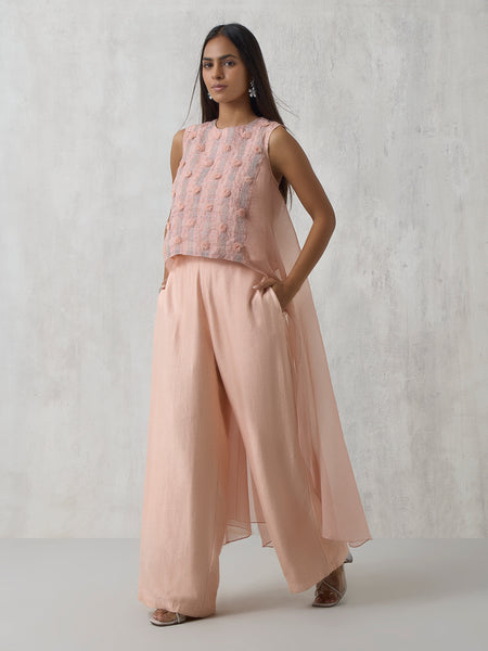Designed for modern festive elegance, this peach co-ord set features a sleeveless top with delicate 3D floral appliqués and linear threadwork across the front. The highlight is its flowy sheer train at the back, adding dramatic movement and ethereal charm. Paired with wide-leg pants in a soft, fluid fabric, the set balances feminine detailing with contemporary ease.