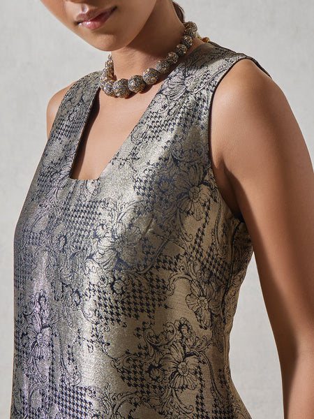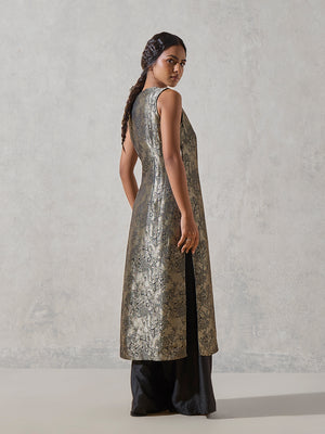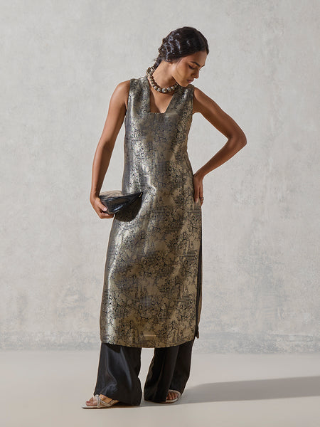 Transcend the epitome of regal elegance with this black jacquard kurta. Decorated with intricate floral patterns all over for added stylishness, this A-line kurta features a square neckline as well as two slits at the sides for added charm.