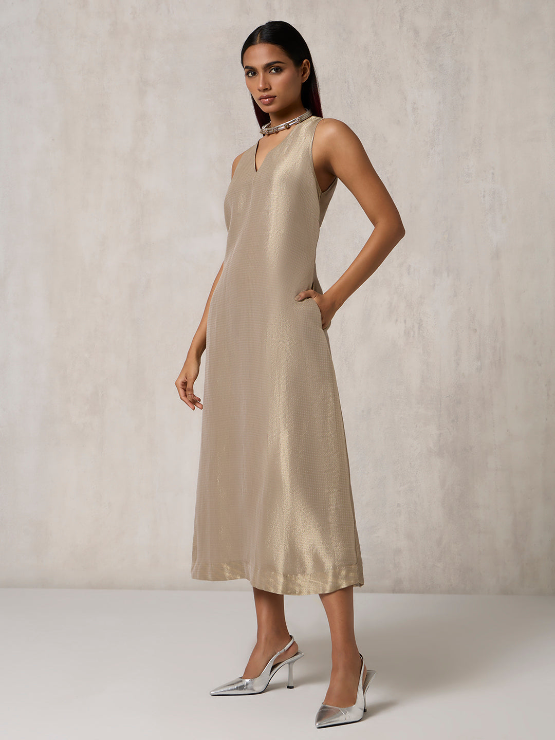 Where texture meets luminosity, this layered ensemble pairs a lustrous slip dress with a sheer lace overlay. The inner dress shimmers softly with a crinkled finish, while the gold-toned lace jacket drapes in delicate florals and scalloped edges. Effortlessly elegant, it’s a study in contrast — fluid light beneath intricate texture, perfect for intimate evening celebrations.