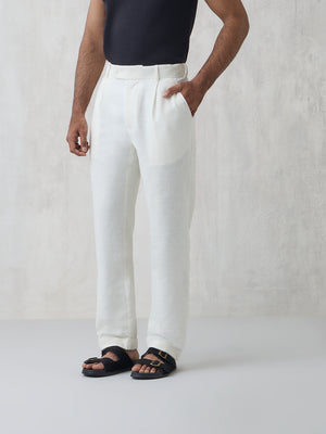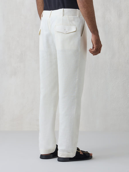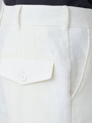 Perfect for summer festivities, these off-white trousers are tailored in a cotton-linen blend for airy comfort. The straight-leg cut and elasticated waistband bring refined ease, making them versatile for day celebrations or evening get-togethers.