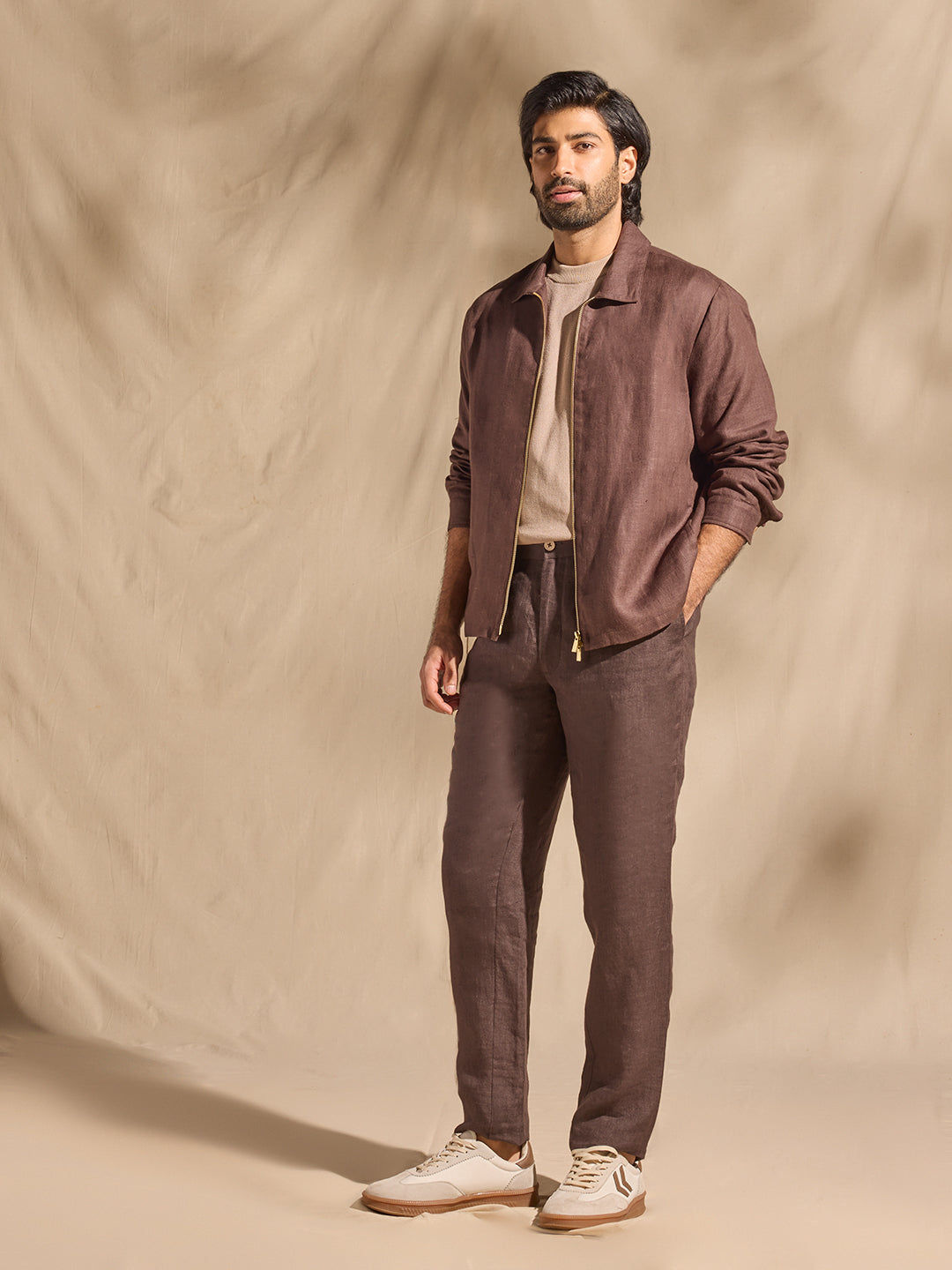 Cut in a rich brown tone with a natural finish, this jacket is built around ease and intention. The fabric has a breathable hand feel that wears comfortably through long hours, while still holding its shape. A clean zip-front closure brings a subtle point of contrast, balanced by a sharp collar that gives the piece structure without feeling formal.