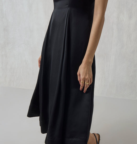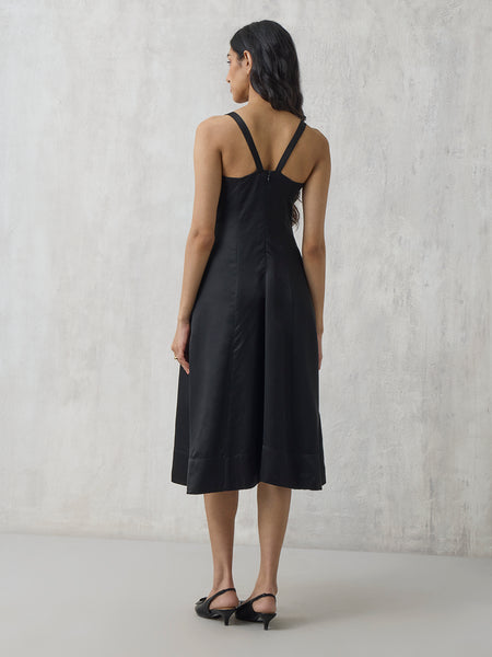 Perfect for after-dark soirees, this black midi dress stands out with its minimalistic yet elegant design. A square neckline, pleat detailing and fit-and-flare frame lends a stylish touch, while its subtle sheen makes it perfect for evening gatherings and festive wear. The zip fastening at the back ensures practical utility.
