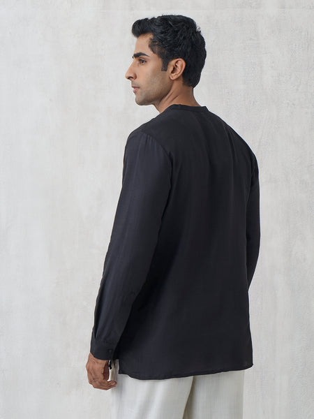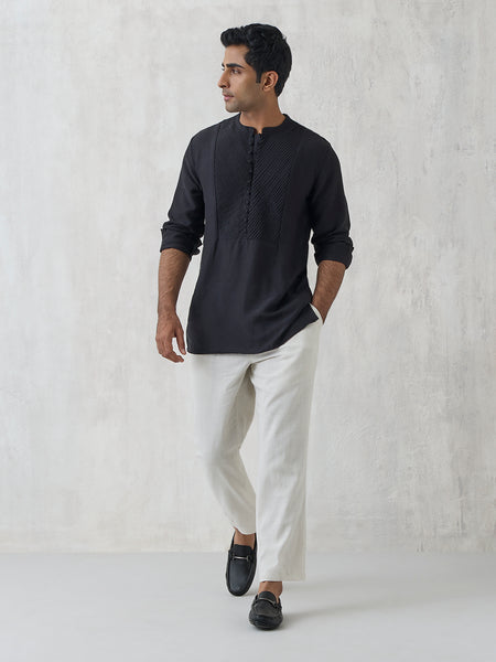 Bring contemporary flair to your festive occasions with this navy kurta, defined by a diagonal pintuck panel for modern depth. A band collar and long sleeves refine the silhouette, making it versatile from day events to evening celebrations.