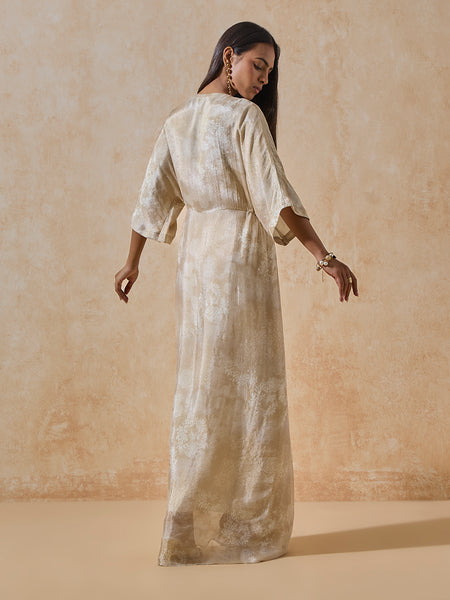 Flowing with quiet drama, this beige dress is cut with a plunging V-neckline and framed by relaxed kimono sleeves. The textured detailing at the bodice draws the eye, while soft pleats release into a floor-grazing silhouette that moves with ease. A natural choice for golden-hour soirées and evening celebrations where elegance feels effortless.