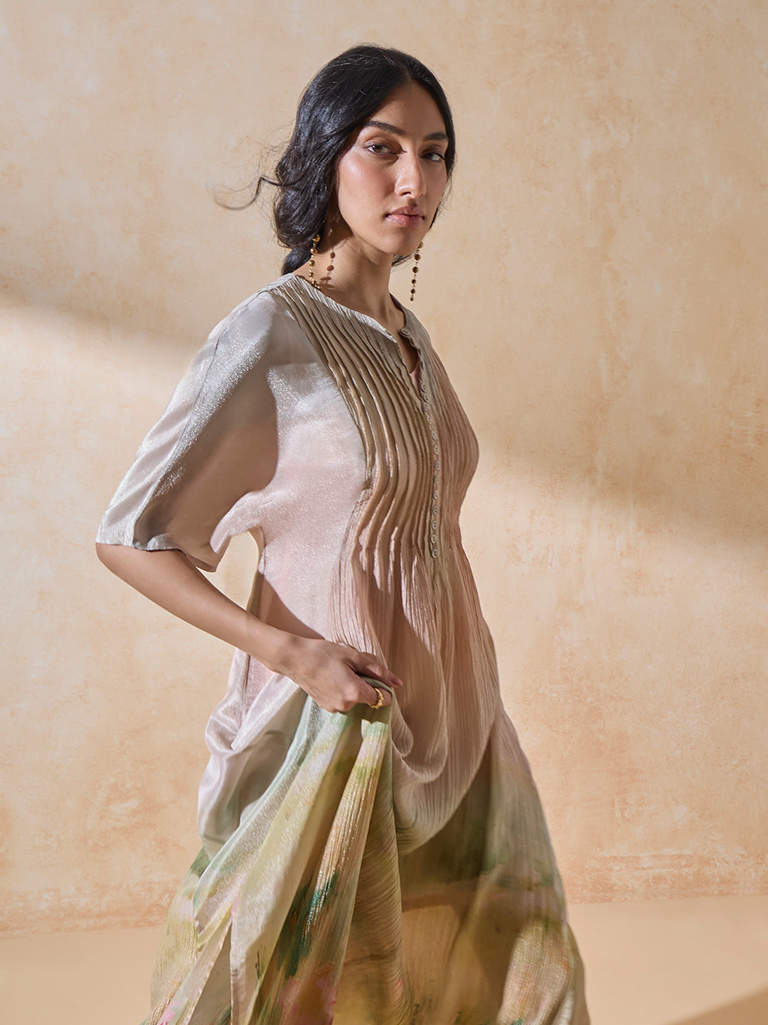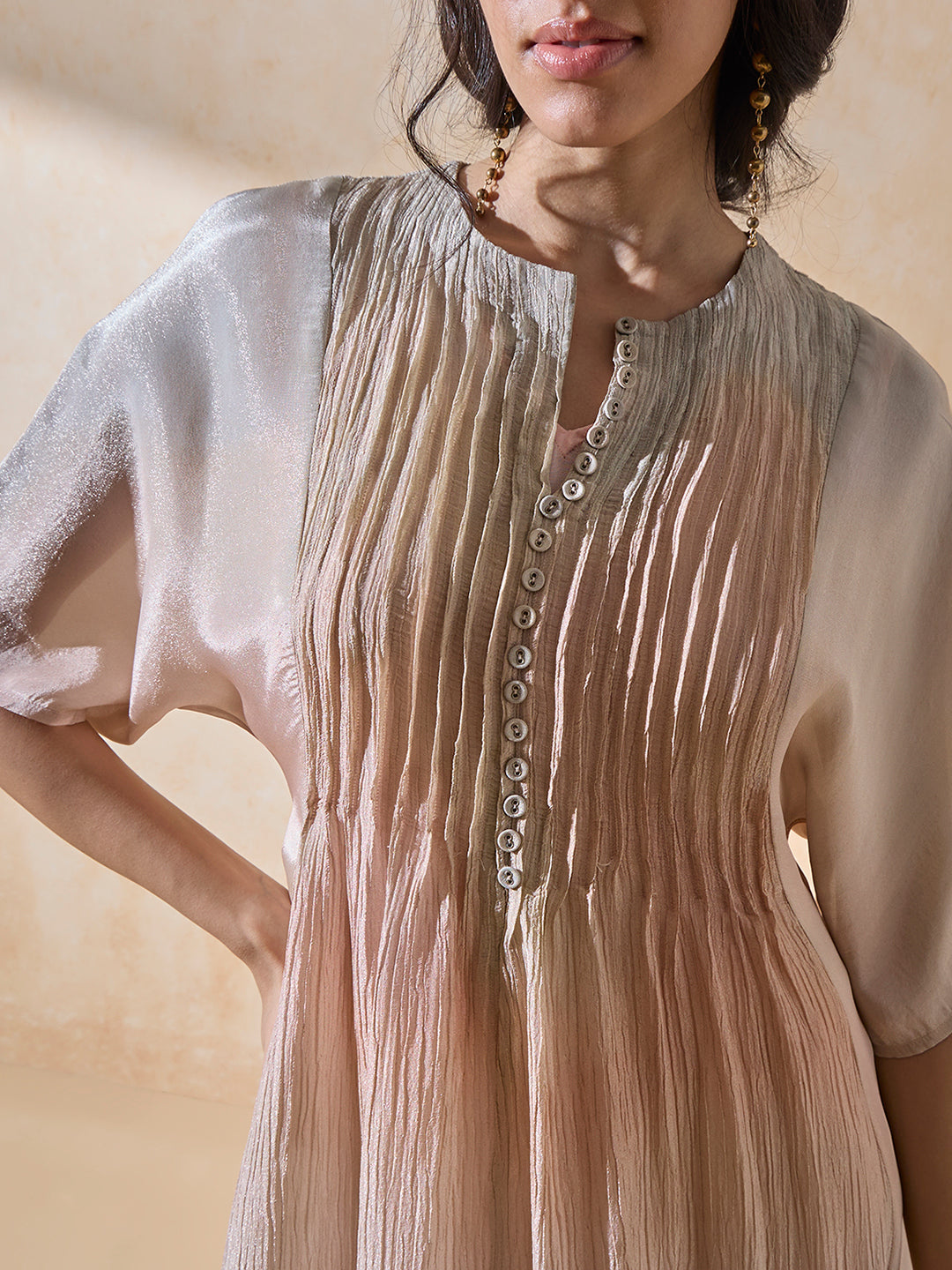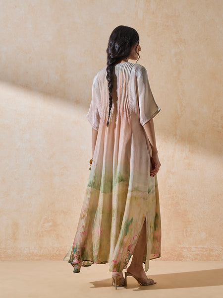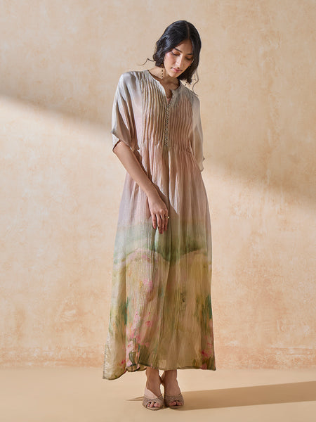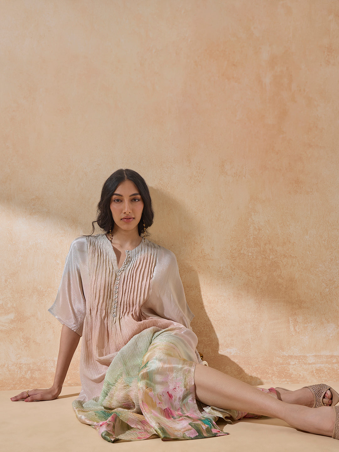 Reimagine effortless elegance with this beige kaftan dress from Samoh. Crafted from lightweight crepe with a gentle sheen, it’s designed to flow gracefully with every movement. Pintuck detailing at the front and delicate button fastenings lend structure to the fluid silhouette, while the dolman sleeves exude relaxed sophistication. The artistic prints across the front add a vibrant burst of colour, making it a refined choice for festive gatherings and daytime celebrations alike.