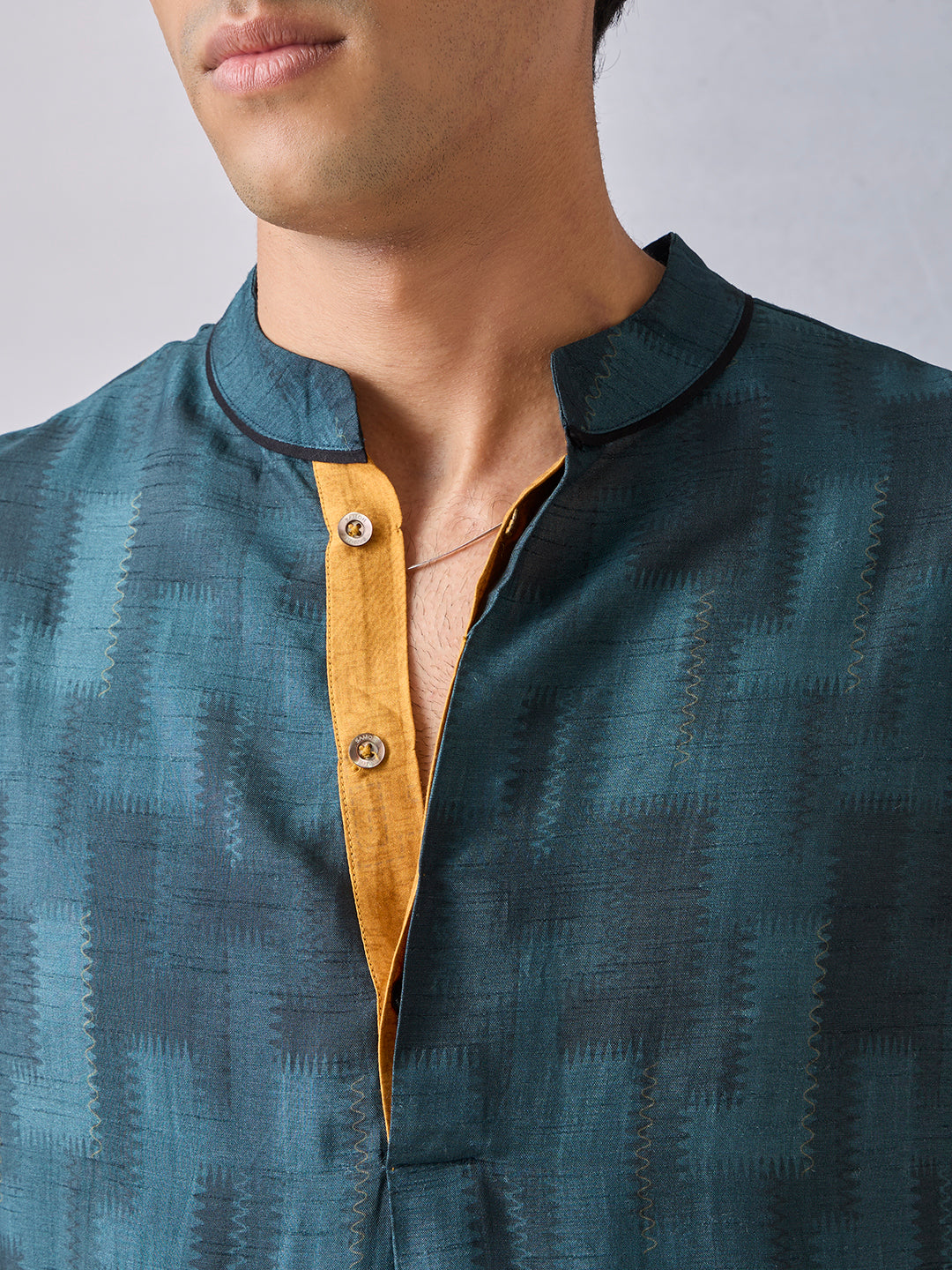 Rejuvenate your festive lineup with this teal kurta that brings fresh energy and refined craftsmanship. Designed in a straight fit with full sleeves, it offers effortless comfort for long celebrations. Its lightweight fabric carries a subtle tonal pattern that adds quiet dimension, while the mandarin collar and refined placket keep the look modern. A discreet flash of mustard along the inner placket and sleeve cuffs provides a sharp contrast, revealing itself with every movement.