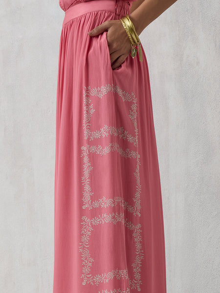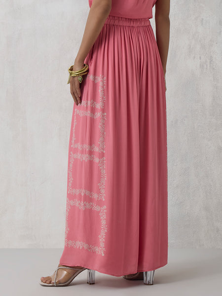 Infused with festive cheer, this pink palazzo brings a lively spin to traditional dressing. The wide-leg silhouette flows with breezy volume, while printed panels add just the right touch of handcrafted charm. A gathered waistband ensures comfort, and pockets bring in everyday practicality.