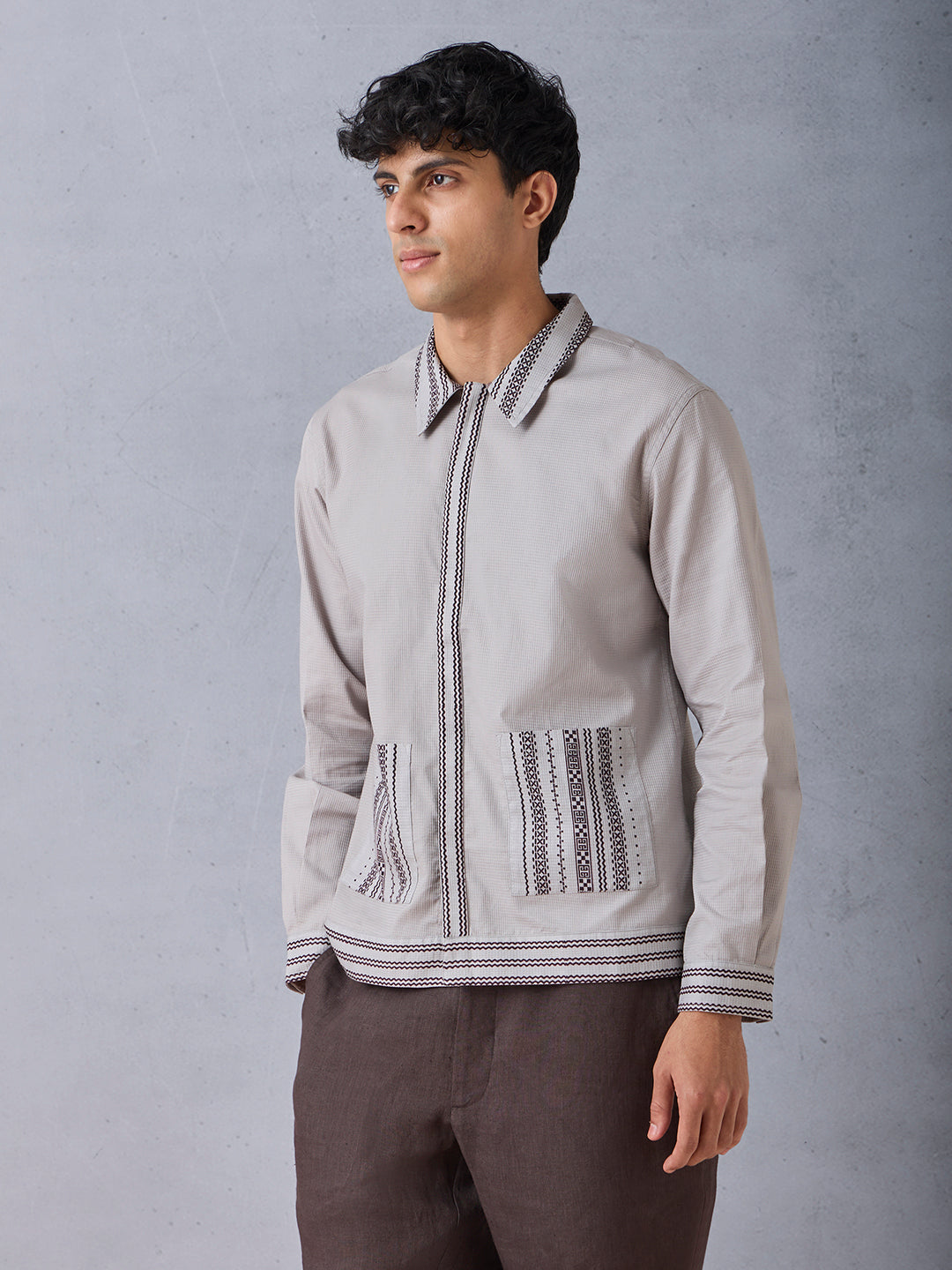 Bring effortless polish to your day-to-day rotation with this grey shirt that balances comfort and craft. Cut with a sharp-point collar and full sleeves, it features intricate contrast detailing along the placket, hem, and pockets, giving the piece a crafted character. The lightweight fabric keeps it comfortable for all-day wear, while the easy silhouette makes it ideal for layering over tees or pairing with linen trousers on slow weekends.