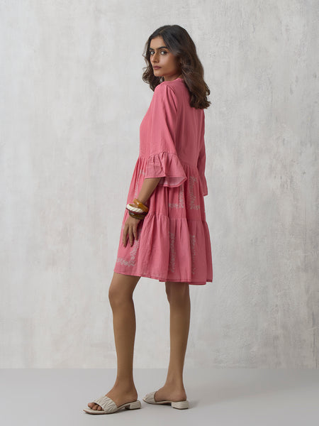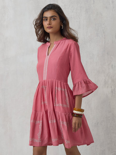 This pink short dress is a playful choice for daytime outings and casual celebrations. Designed with a split neck, it features tiered panels embroidered with delicate floral motifs that add texture and charm. The flute sleeves and easy silhouette bring movement and comfort, making it a versatile piece you’ll reach for through the season.
