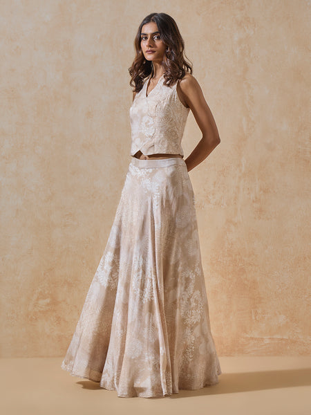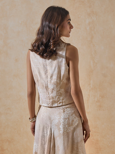 This beige top brings a contemporary twist to occasion dressing. The sleeveless cut and plunging V-neckline highlight the shoulders, while the angled hem lends a structured finish. With floral motifs woven into the fabric, it’s the kind of piece that balances polish and play.