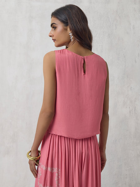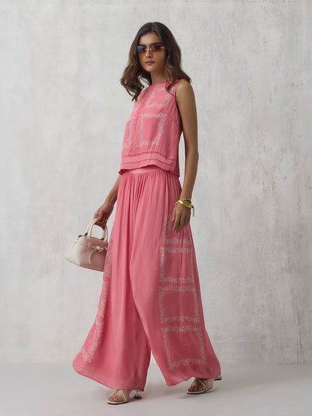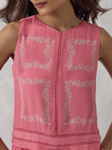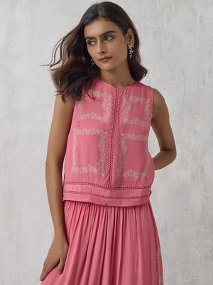 Elevate your style quotient with this pink sleeveless top. The straight cut is detailed with motifs that lend a graphic edge, while lace inserts along the front and hem add a touch of delicacy. Designed for versatility, it works easily with wide-leg palazzos for a co-ordinated statement.