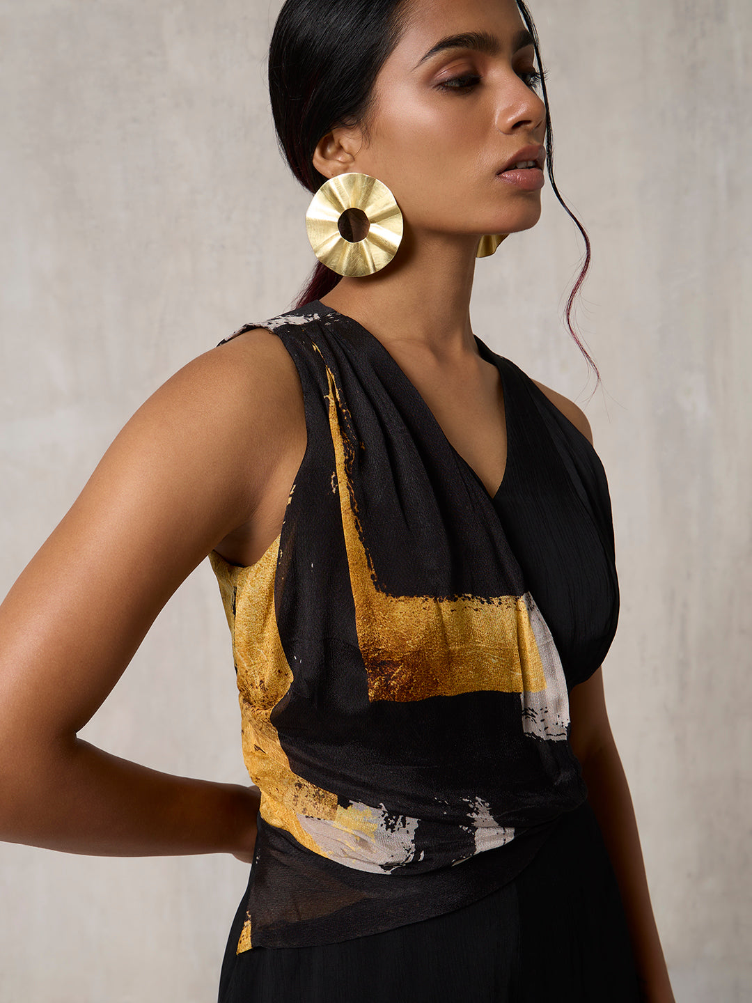 Sleek and sculptural, this black jumpsuit blends fluid tailoring with artful design. The wide-leg silhouette flows with quiet drama, while a contrasting draped panel in gold and ivory tones knots gracefully across the bodice. Finished with a deep V-neckline and practical pockets, it’s a statement in modern elegance for after-dark celebrations.