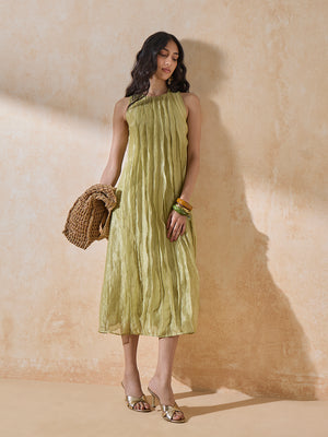 Fashioned for modern women, this green midi dress is stylish essential. Featuring ruffles all over the front for feminine charm, this stripe-printed dress is cut in a straight breezy frame and comes fashioned with a round neckline, slit pocket and keyhole detailing at the back with a button fastening.