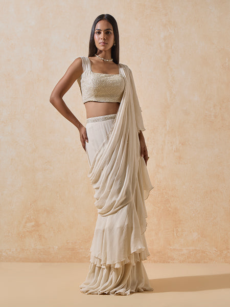 Ruffled Ready-To-Wear Saree - Ivory custome Product