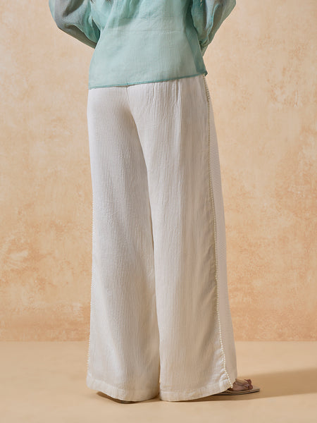 Elevate your separates with these white trousers, tailored in a clean straight fit for a sleek look. Crafted from textured fabric with subtle vertical stripes, they feature a delicate row of beads along the side seams adding just the right touch of understated embellishment. Versatile and elegant, they pair effortlessly with both airy blouses and structured shirts for day-to-evening dressing.