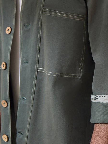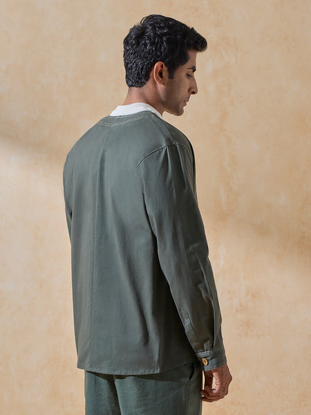 An artisanal layer with a modern spirit, this olive jacket is defined by contrast stitching and patterned cuffs. Designed with a V-neckline and finished with details like patch pockets and circular buttons, it balances traditional craftsmanship with contemporary tailoring. Perfect for layering over festive kurtas or crisp shirts, this versatile piece brings a distinctive edge to celebratory dressing.