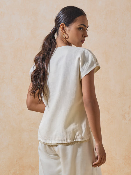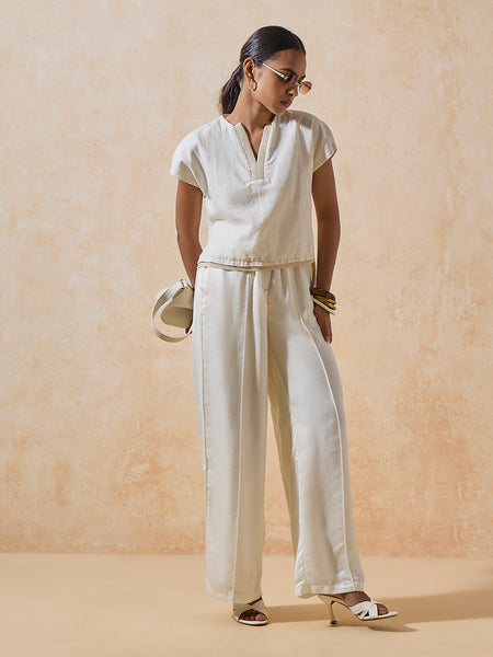 Add subtle shine to your everyday edit with this off-white top, crafted in a textured linen-blend fabric for natural ease. Designed with a V-neckline framed in delicate bead trim, it is finished with matching detailing along the hemline for understated glamour. The relaxed silhouette with dropped sleeves makes it a versatile piece that pairs effortlessly with flowing skirts or tailored trousers.