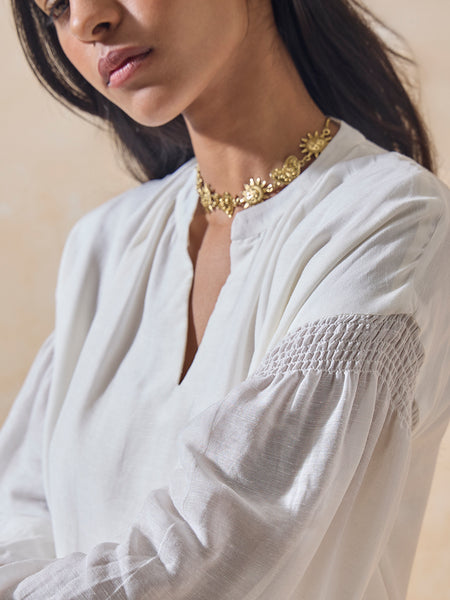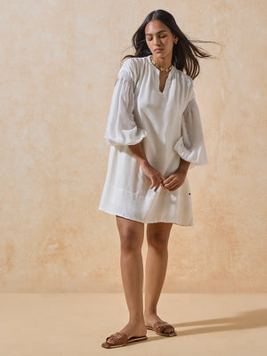 Refresh your everyday wardrobe with this white dress, designed in a voluminous silhouette that captures effortless modern ease. A split neckline lends a relaxed frame, while smocked detailing at the shoulders and upper sleeves introduces subtle texture. Balloon sleeves add soft structure, balancing movement with shape.
