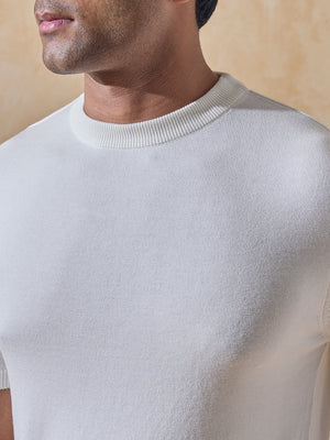 A modern festive essential, this white t-shirt is styled with a ribbed crew neckline and short sleeves. Minimal yet refined, it layers easily under jackets or stands alone for understated celebrations.