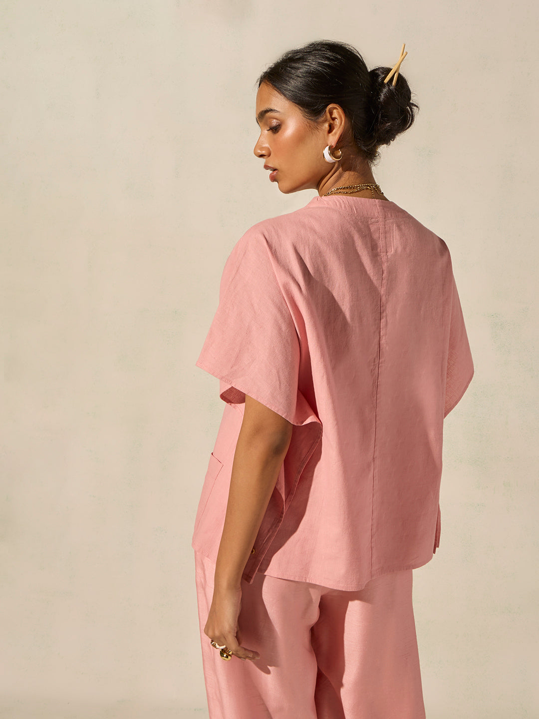 This pink top lends quiet elegance to contemporary dressing. Spun from a breathable fabric, it features a soft V neckline with textured detailing, relaxed drop sleeves, and a fluid silhouette that drapes with ease. Finished with functional front pockets, it balances comfort and polish effortlessly.