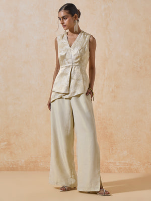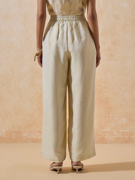 Designed for understated sophistication, these wide-leg trousers bring versatility to your festive dressing. The front-zip closure and soft elasticated back ensure a seamless fit, while the subtle sheen adds an elevated finish. Style them with a metallic kurta or embroidered top for a modern yet timeless ensemble.