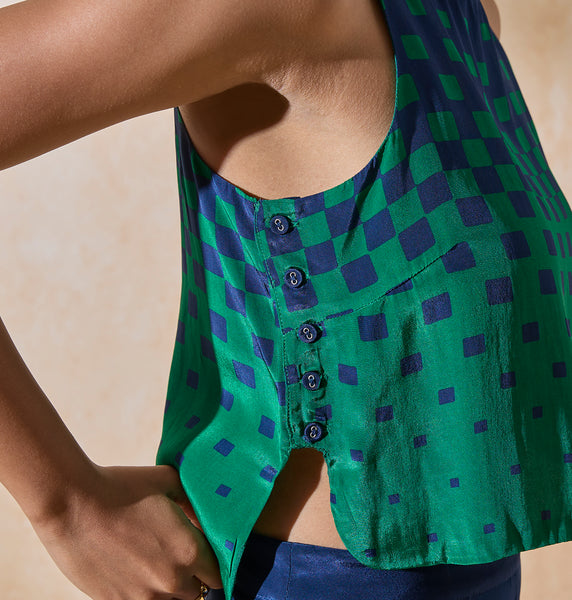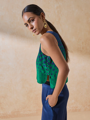 Refresh your ethnic rotation with modern designs like this green top from Samoh. Created from a soft fabric, this sleeveless separate is fashioned with a scoop neckline and blue square shaped designs all over for contemporary style. It features a high-low hemline and button-fastenings at the sides for added charm.