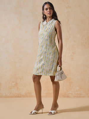 Turn heads with this sleeveless dress, designed in a vibrant palette of yellow, blue, and orange layered beneath a sheer striped overlay. The short rounded collar is richly embellished with pearl-like beads, adding a touch of opulence to the playful silhouette. Falling above the knee, its textured slatted effect creates modern dimension, making it a standout choice for contemporary daywear or chic evening occasions.