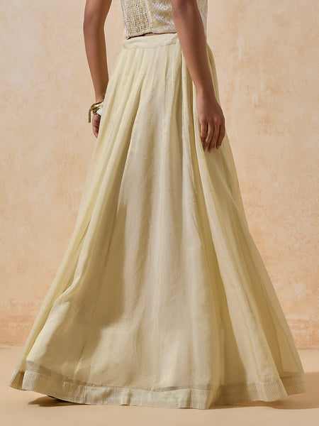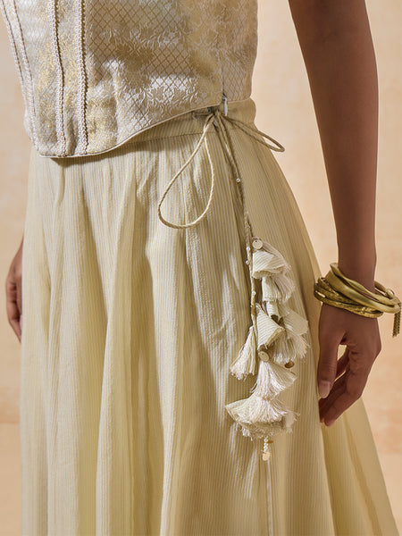 Graceful and versatile, this gold-toned skirt is designed in a fluid silhouette that sways beautifully with every step. The side tie-up detail with tassels enhances its festive appeal, while the subtle metallic finish adds just the right hint of shimmer. Pair it with a coordinating blouse for a refined celebration look.