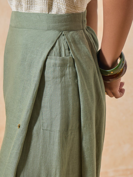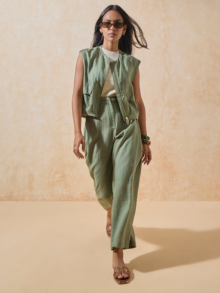 Channel effortless sophistication with these sage green trousers , tailored in a wide-leg cut for fluid movement. Crafted in linen for breathable comfort, the high-waist design is refined with a flat front panel and discreet slit closure. A small hip pocket accented with a brass detail adds a subtle touch of character, making this pair a versatile choice for modern daywear and evening edits alike.