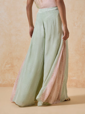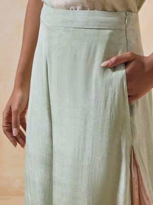 Redefine contemporary ease with these green palazzos, crafted in a flowing fabric with a subtle textured pattern. The wide-leg silhouette is elevated with a long side slit that reveals a soft blush-toned lining adorned with faint prints. Effortlessly balancing comfort and sophistication, this statement piece transitions seamlessly from daytime outings to chic evening edits.