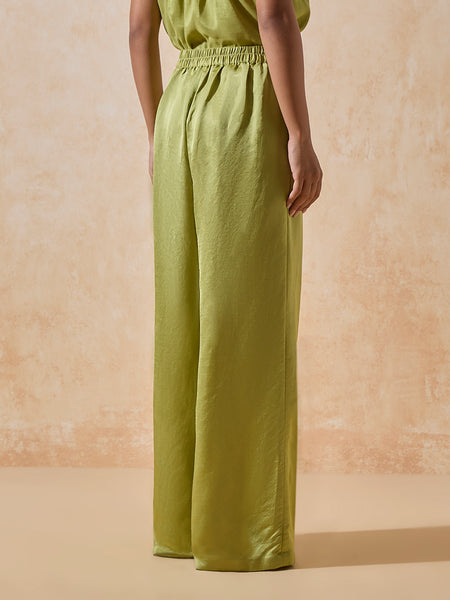 Give your ethnic wear a versatile addition like these green palazzos. Carved in a wide-leg profile, these minimalistic palazzos are thoughtfully designed with an elasticated waist for an adjustable fit along with a slit pocket at the side for utility.